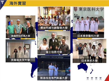 本系學生於第六學年可依各校申請資格及本身志趣申請海外交換實習學校。本系與多國、多所學校皆有交換實習合作,豐富多元。目前海外交換實習學校有美國UAB、日本東邦大學、日本東京醫科大學、斯洛伐克Comenius、德國維也納Vienna、韓國Yeungnam等。