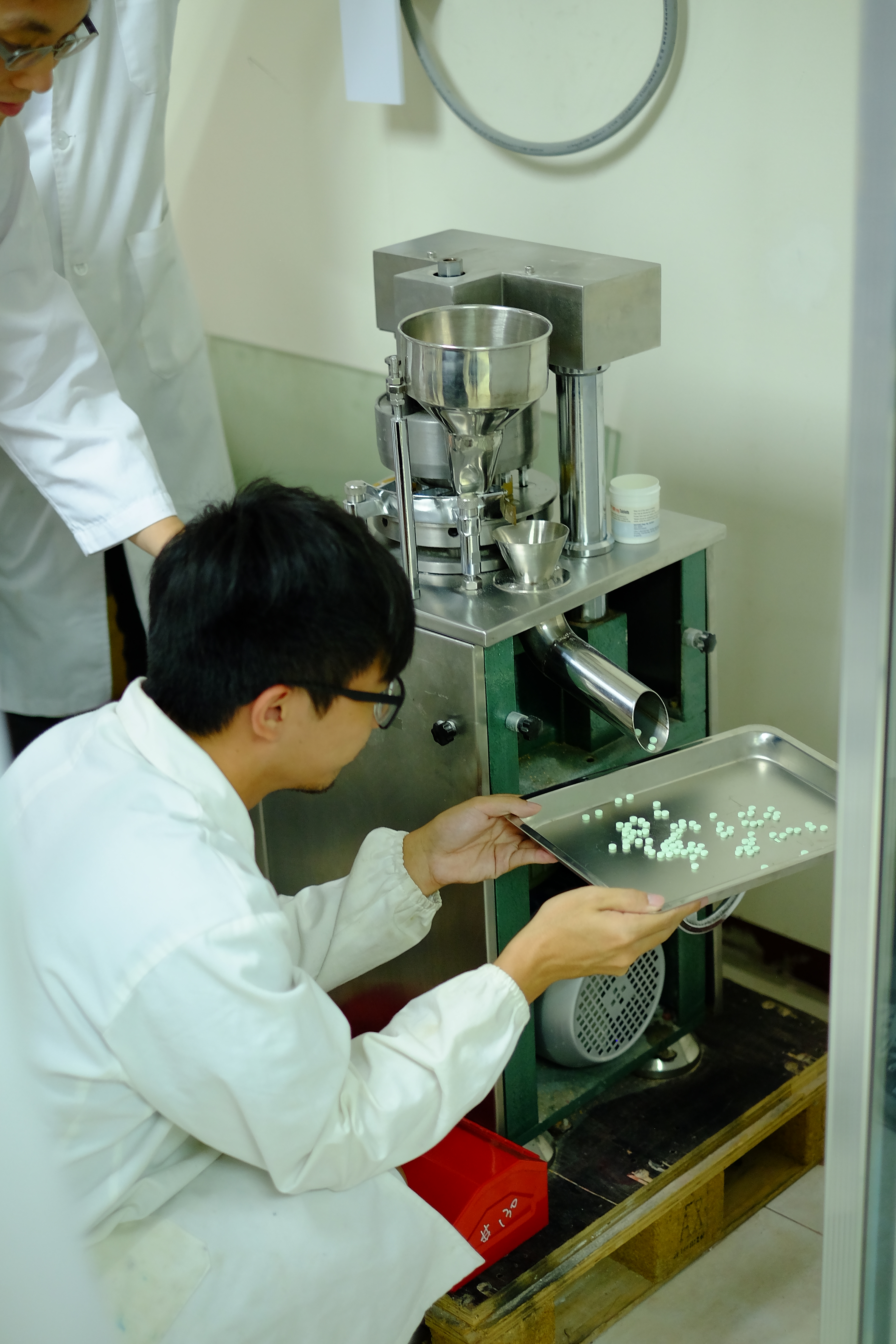 問題導向學習(PBL): 問題導向學習與傳統上課為許多大學採用教學之模式,但問題導向學習是由大班而小班、由主題式教學而問題導向學習、由老師為中心轉換到學生為中心、從被動學習而主動學習、由教學生知識而引導學生追求知識。課堂中不停規劃新的教材和教師、學生想法,以強化學生專業知識、能力訓練與學習態度 。 圖解:分組討論 版權:高醫藥學系 實驗操作:藥物製造操作 。 圖解:學生操作打錠機 版權:高醫藥學系