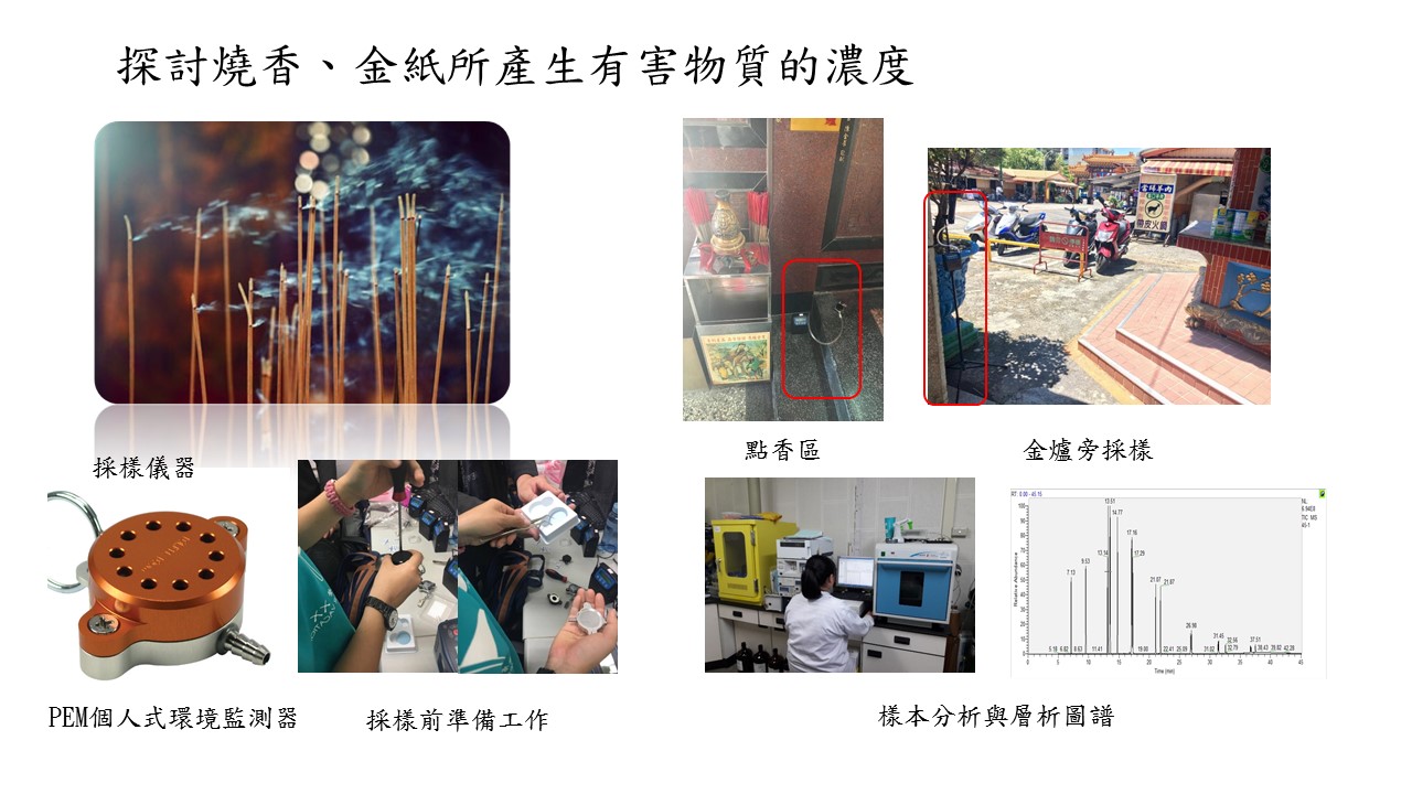 作業環境測定針對環境中的危害因子之認識、測定方法、採樣技術、分析方法,完整的解說,使學生能熟悉作業環境測定的進行,提供實地操作的機會,讓學生發揮課堂所學,評估環境的良窳與工作者的暴露濃度。 圖解:燒香產生有害物質的濃度 版權:學生自製