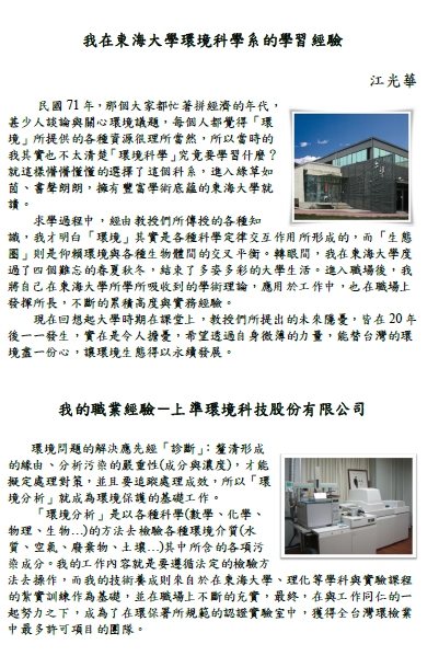 江光華民國71年,那個大家都忙著拼經濟的年代,甚少人談論與關心環境議題,每個人都覺得「環境」所提供的各種資源很理所當然,所以當時的我其實也不太清楚「環境科學」究竟要學習什麼?就這樣懵懵懂懂的選擇了這個科系,進入綠草如茵、書聲朗朗,擁有豐富學術底蘊的東海大學就讀。(節錄,全文如圖片) 環境問題的解決應先經「診斷」:釐清形成的緣由、分析污染的嚴重性(成分與濃度),後擬定處理對策,且要追蹤處理成效,所以「環境分析」為環境保護的基礎工作。「環境分析」是以各種科學(數學、化學、物理、生物…)的方法去檢驗各種環境介質(水質、空氣、廢棄物、土壤…)其中所含的各項污染成分。我的工作內容就是要遵循法定的檢驗方法去操作,而我的技術養成則來自於在東海大學---(節錄,全文如圖片)。 未上傳圖片