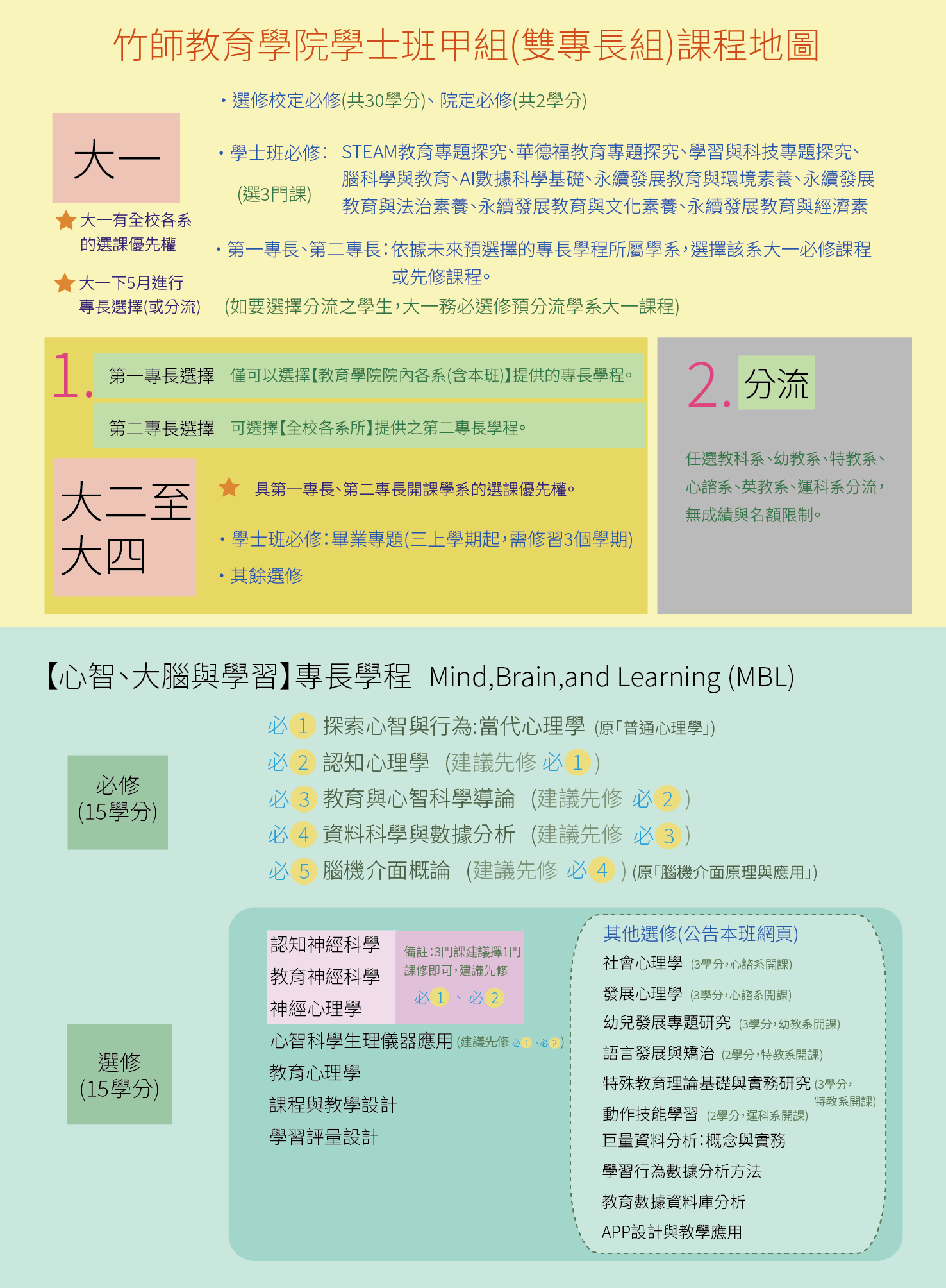 竹師教育學院學士班,採兩個專長的修課模式,大一擁有全校各系的選課優先權,可自由選擇各系的課程,學生可利用彈性與自由的選課機制,自我探索與定向自我的專長選擇。在大二前可依志向選擇本班第一專長「心智、大腦與學習」或本院各系提供的第一專長學程;第二專長可選擇全校不限學系的第二專長學程(沒有任何名額與門檻限制)。清大擁有豐富的跨領域修課資源及制度,歡迎對於跨域學習有興趣者報考。 |
