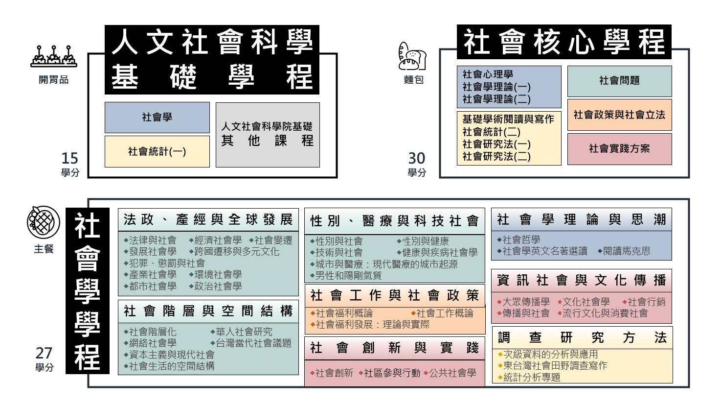 本系有基礎的社會學課程,多個特色課程是我們的與眾不同,包括「法律社會、犯罪防治與觀護學程」、「公共與勞工事務微學程」、社工學分、進階數據分析、中等師資培育等,有利學生接軌就業市場。我們的優勢來自學生可以取得國立大學的教育資源,包括多項獎助學金、國外移地教學、國際交換學生的機會更高於許多大學、與歐美和日本簽屬多個雙聯學位等。完善的雙導師輔導制度讓東華社會學系的師生關係是有溫度且共感美好。 |