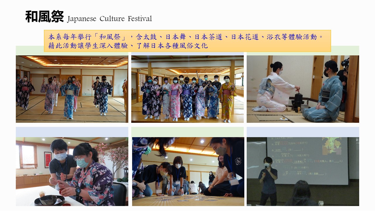 應日系於每年5月辧理之重要特色活動—和風祭,從活動的企劃、宣傳到執行,皆由應日系系學會同學們主導。藉由和風祭活動,讓學生除了凝聚向心力外,同時於活動中運用所學之日語,更重要的是能從中學習與不同單位進行溝通協調之能力,有助於未來職場就業能力。 圖解:應日系和風祭 版權:義守大學應用日語學系所有 |