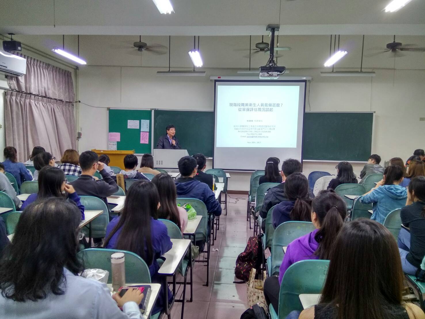 專題講座:每學期定期舉辦3至5場專題講座,聘請業界著名人士分享職場上實務相關議題。 圖解:邀請國立成功大學蔡朋枝特聘教授專題講座 版權:長榮大學職安系