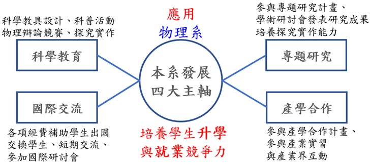 應用物理系積極推動國際合作,目前已與越南、泰國、俄羅斯、法國等國家的學研機構建立合作研究及師生交流之合作關係,以培養學生的國際視野與國際移動力。另外,本系帶領學生組成團隊參與科學類競賽(例如::科學教具設計競賽、科學探究實作競賽)、鼓勵學生修習專題研究參與執行國科會專題研究計畫與產學合作計畫,及鼓勵大四學生參與1學期或1年的產業實習,以培養學生動手做的實務能力及增強與產業鏈結。