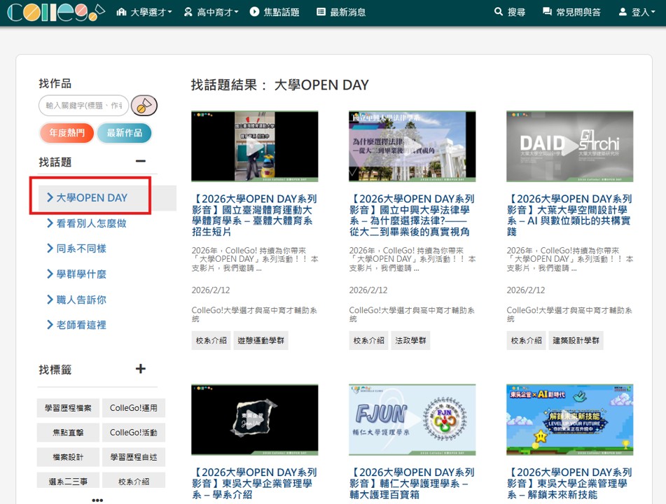 路徑2. 進入焦點話題專區->點選找話題【大學OPEN DAY】,可一次閱覽今年參與影片!
