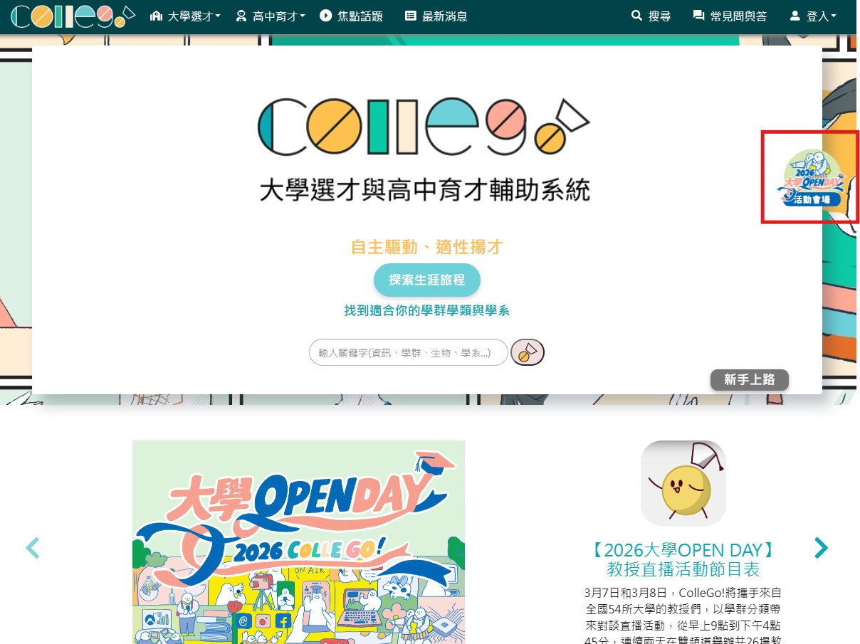 你發現了嗎?熟悉的小圓球再度登場了!2026 ColleGo!大學OPEN DAY系列活動在2/25到3/8間限定開啟,只要點擊畫面右方圖示即可進入活動會場。今年ColleGo!攜手60所大學,再次帶來直播X影片X社群三大主題,幫助同學們找到未來的方向。快來看看有哪些精彩的內容等著你吧!