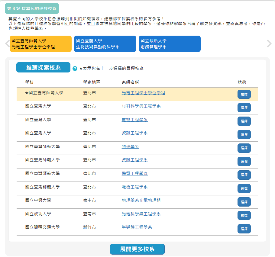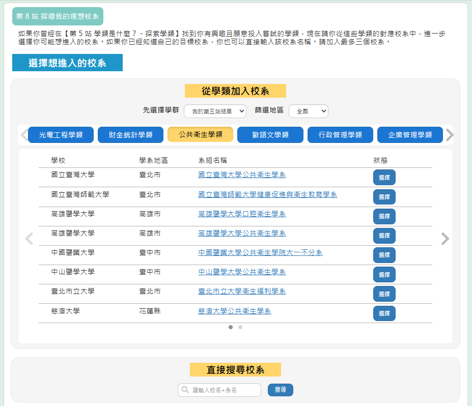 延續1-7站探索結果,同學們可透過感興趣的學類找到初步的校系選擇清單,同時透過校系所在地區篩選,並閱讀學系關鍵資訊找出理想的目標校系。此外,也可以直接透過校系名稱搜尋找到目標校系。藉由目標校系的初步設定,可將選項聚焦於特定的方向,提高後續探索的效率。