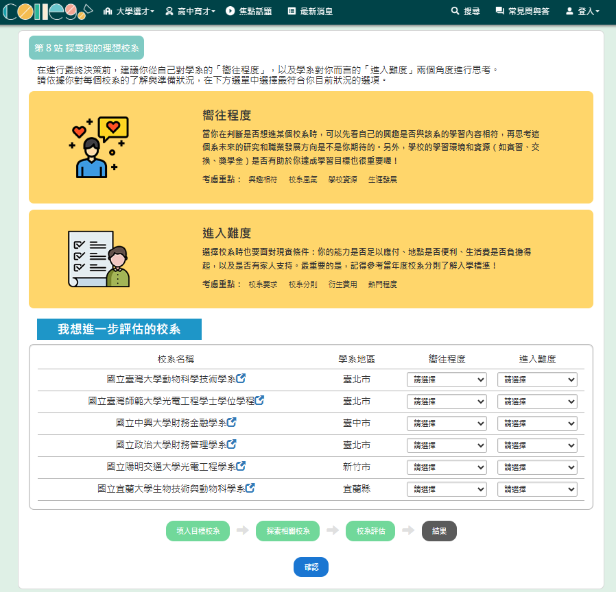 在完成探索後,系統引導學生進行量化評估,將原本抽象的「感覺」轉化為可分析的數據。評估面向包含嚮往程度與進入難度。嚮往程度的評估可由興趣相符、校系氛圍、學校資源、生涯發展等角度思考;而進入難度則需要多注意錄取條件、校系分則、衍生費用、熱門程度等等的外在條件。透過針對兩個向度的評分,同學們可以更理性地檢視自己與各個心儀校系的適配程度。