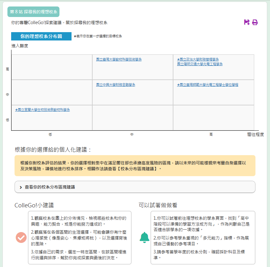 完成三階段的探索與評估後,結果頁面以「九宮格矩陣」方式呈現,將所選的校系依據嚮往程度與進入難度的分布呈現,藉由視覺化的整理協助同學們掌握探索結果。同時,系統也會提供專屬的分析與建議,提供同學們有效收斂並優化整體志願排序的策略。