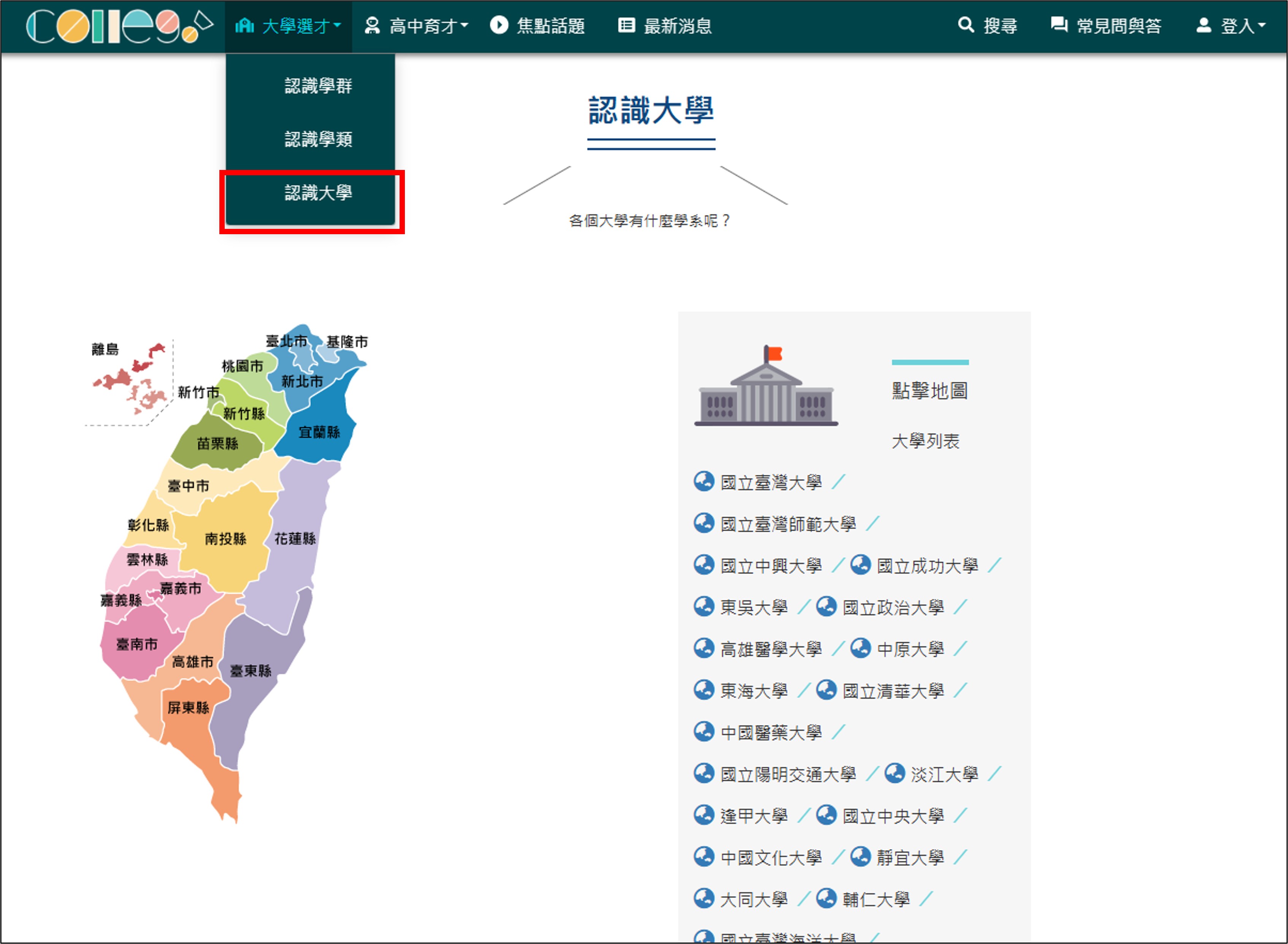 透過ColleGo!認識大學頁面,可了解各個大學的發展特色