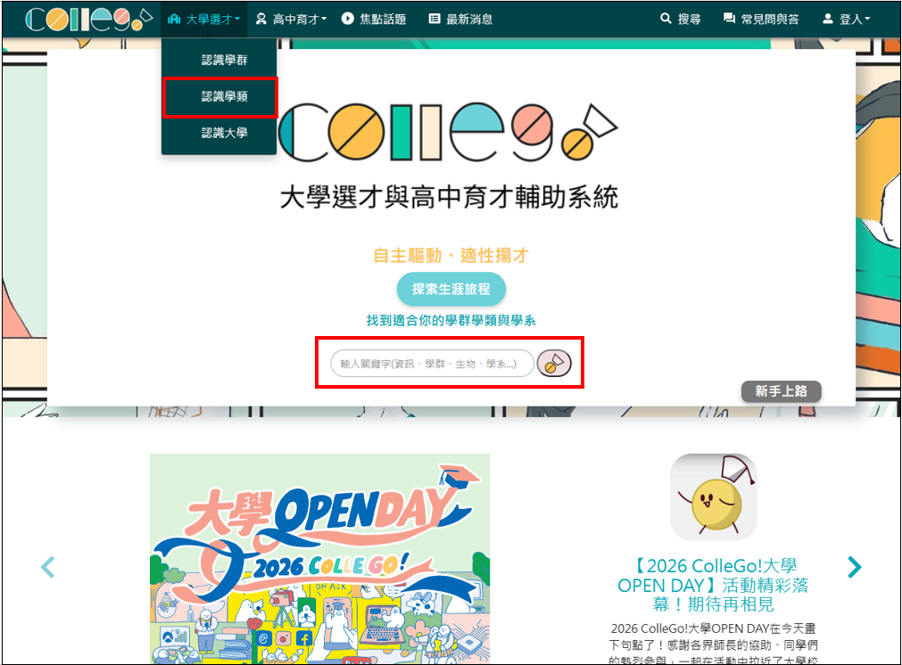 可透過ColleGo!認識學類或於搜尋欄輸入關鍵字,閱讀感興趣的學類介紹