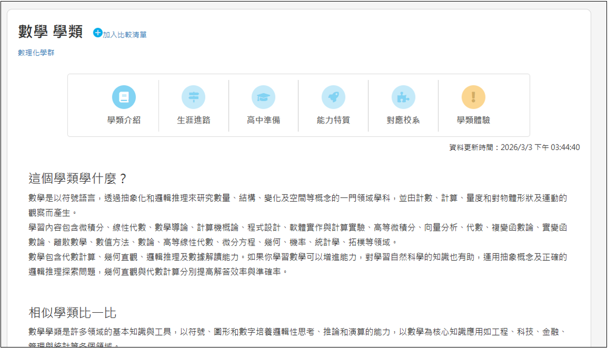 找到特定學類後,可切換不同資料(如學類介紹、生涯進路等)閱讀更多