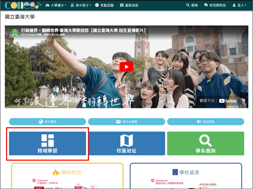 在認識大學頁面中,可查詢各校跨域學習相關資訊,如圖為臺大的認識大學頁面