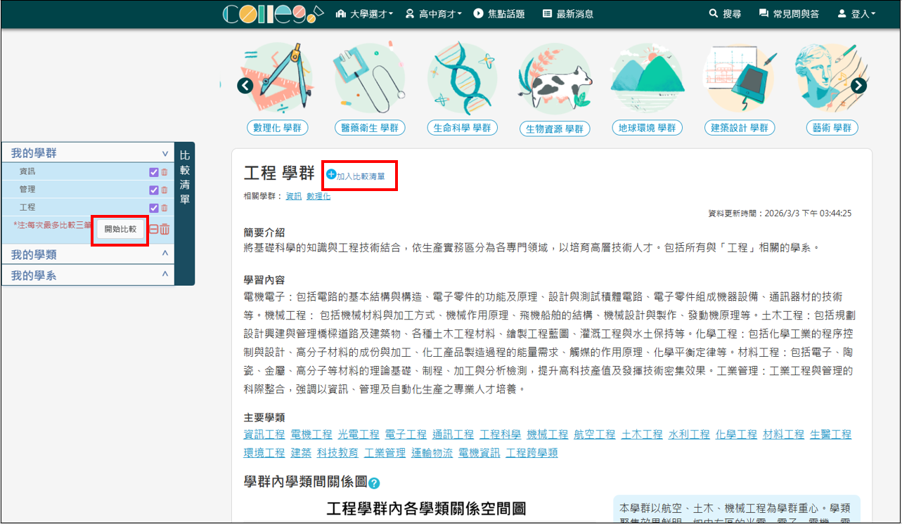 如果同時對多個學群或學類感興趣,可以搭配「比較功能」查詢。只要將希望比較的標的加入比較清單,就能一次看到最多三個學群或學類的資訊,透過相互比對,可以幫助孩子找到最理想的目標。